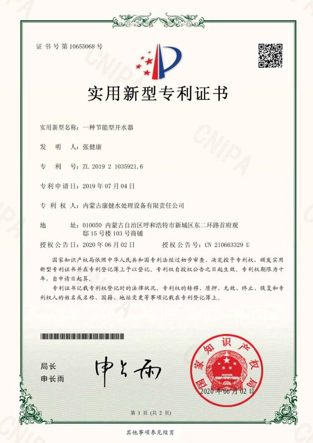 內(nèi)蒙古康健水處理設(shè)備有限責(zé)任公司是專業(yè)生產(chǎn)制造水處理設(shè)備、飲料設(shè)備、奶設(shè)備、殺菌設(shè)備、灌裝設(shè)備五大系列90余種配套產(chǎn)品。在反滲透、超濾、納濾、EDI模塊、等膜分離領(lǐng)域有著雄厚的技術(shù)實力,同時在水廠設(shè)計、中水回用、污水處理、分質(zhì)供水、無負壓變頻供水、鍋爐軟化水設(shè)備等領(lǐng)域有完善的技術(shù)團隊和營銷網(wǎng)絡(luò)。公司坐落在遼闊大草原上美麗的首府——呼和浩特,是內(nèi)蒙古自治區(qū)唯一一家具有自主生產(chǎn)能力的企業(yè)。 “上善若水,水利萬物而不爭”康健水工自成立以來,始終堅持“改善水質(zhì)、造福人類、服務(wù)社會、產(chǎn)業(yè)報國”的企業(yè)信條,以致力于開創(chuàng)人類綠色健康生活為己任,秉承“關(guān)愛生命、責(zé)任至上”的企業(yè)宗旨,成就了享譽四方的國內(nèi)知名水處理企業(yè)。 水是生命的源泉、工業(yè)的血液、城市的命脈。水是不可替代的寶貴資源。節(jié)約用水,關(guān)注點滴 為節(jié)約水資源貢獻一份力量, 健康飲水,利在當代,功在千秋! 只有在這里,才能領(lǐng)會水的精髓;只有在這里,才...